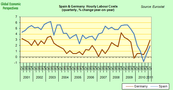 Nej, titta på den här grafen som visar kostnaderna för arbetskraft. De har legat 2% högre än Tyskland i 10 år. Spaniens ekonomi har blåsts upp av de centralplanerade räntorna, som har varit onaturligt låga. Arbetsgivare och arbetstagare kan nu inte komma överens om villkoren. Skulle spanjorerna sänka sina löner med 30% skulle arbetslösheten snabbt sjunka. Spanien devalverade två ggr under 90-talet (då arbetslösheten hade stigit upp till 25%) och arbetslösheten föll snabbt.