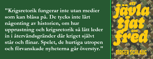 "Dessvärre har jag inte hört en enda kritisk fråga från SVT:s säkerhetspolitiske reporter. Tvärtom fungerar han, liksom så många andra, som någon sorts bollplank till det urval av experter man väljer att intervjua. (-) Alla tycks springa i flock, som lämlar. Som om varenda lång tanke vore bannlyst. Som om varenda kritisk fråga vore en säkerhetsrisk."